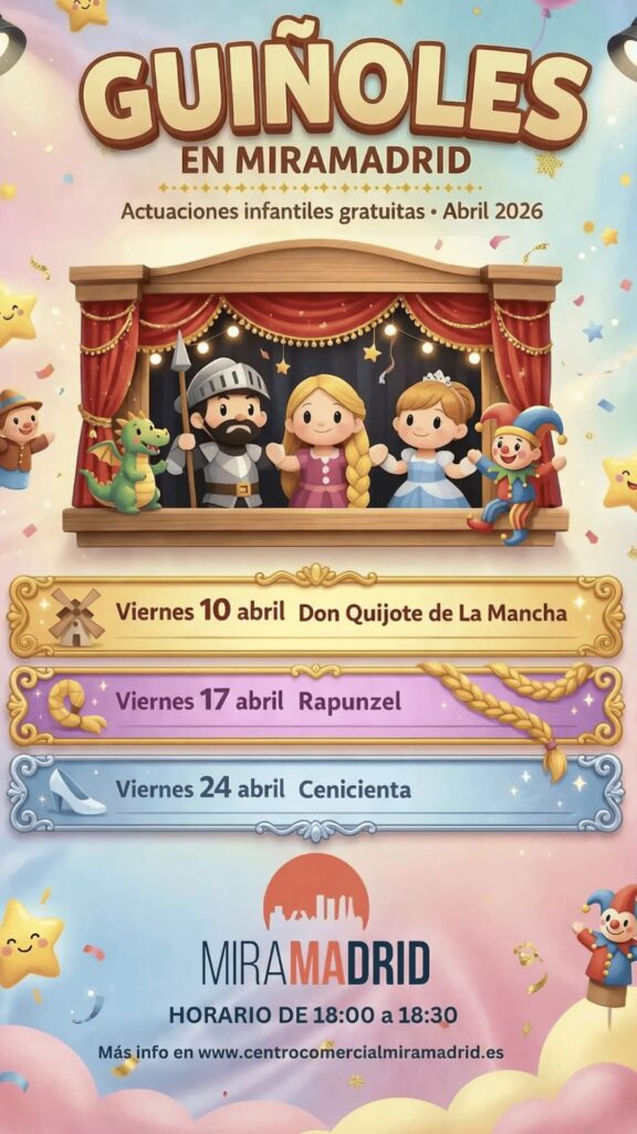 En el Centro Comercial Miramadrid damos la bienvenida a la primavera con una programación especial de actuaciones infantiles gratuitas, pensadas para que los más pequeños disfruten de la magia del teatro de guiñol en un entorno familiar.